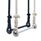 Un trapèze de style classique comporte des cosses en acier inoxydable sur la barre, à chaque extrémité. Les cordes sont épissées et fouettées directement sur les cosses, ce qui permet d'obtenir un coude massif et rigide, mais souple et confortable sur tout le pourtour.