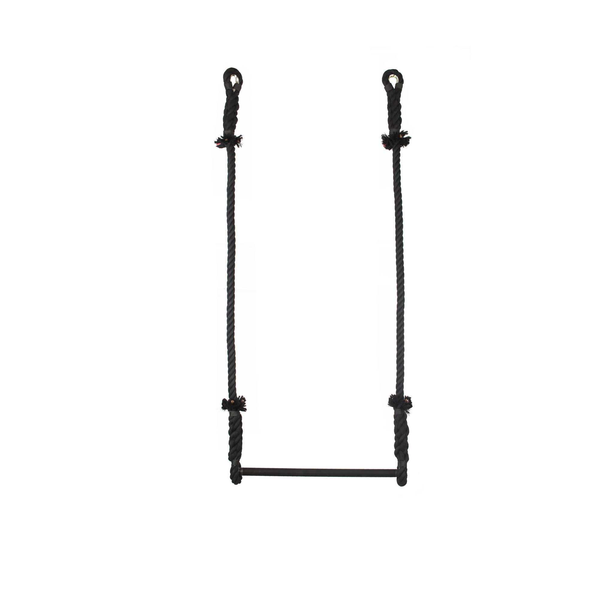 La façon la plus courante de monter un trapèze. Cette méthode permet de séparer les deux cordes et laisse suffisamment d'espace pour les mouvements au-dessus de la barre.